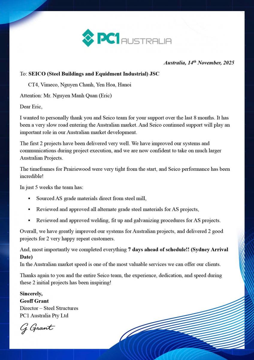 SEICO is honored to receive positive feedback from Mr. Geoff Grant, representative of PC1 Australia, following the collaboration on projects delivered to the Australian market.